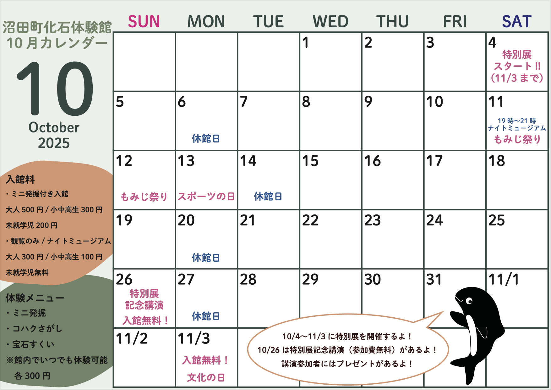 10/4(土)からヌマタネズミイルカ発見40周年記念特別展を開催しております! 今年度最終開館日11/3(月・祝)は入館無料です!! 恐竜・化石スタンプラリー開催中です!詳細は下の画像をチェック!! 5/31(土)から体験館内でのミニ発掘体験復活しました!!ミニ発掘とコハクさがしは館内で体験できます。※団体利用時はミニ発掘体験を中止させていただきます。