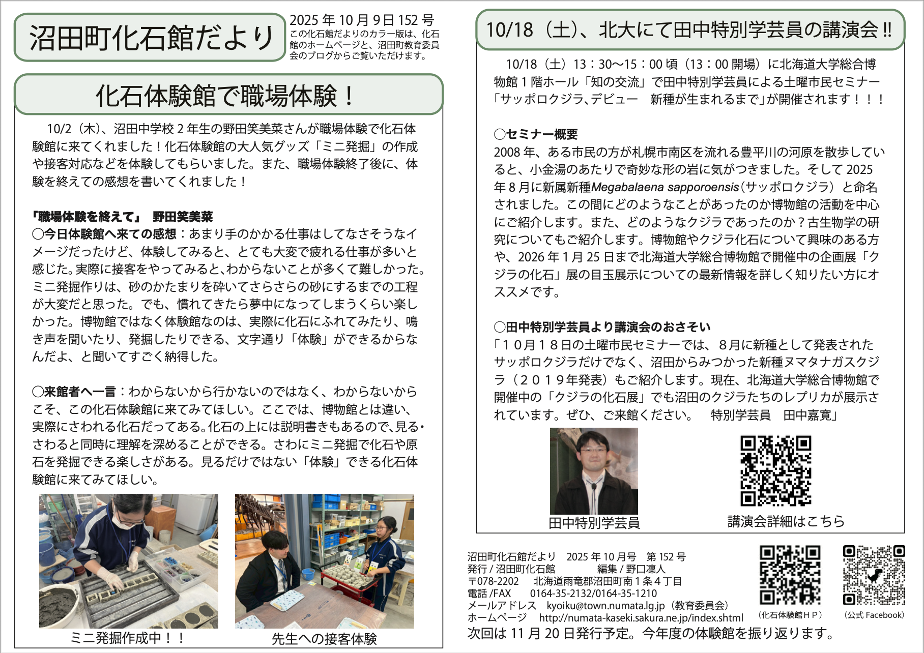 ・化石体験館:北海道雨竜郡沼田町幌新381(ほろしん温泉向かい) Tel/Fax 0164-35-1029(夏期のみ) Mail:kaseki@guitar.ocn.ne.jp ・冬期のお問い合わせ 沼田町教育委員会:北海道雨竜郡沼田町南1条4丁目6-5 Tel/Fax 0164-35-2132/0164-35-1210 町内で化石採取を希望される方は様式をダウンロードし下記連絡先(沼田町教育委員会)に提出してください Tel/Fax 0164-35-2132/0164-35-1210 Mail:kyoiku@town.numata.lg.jp |